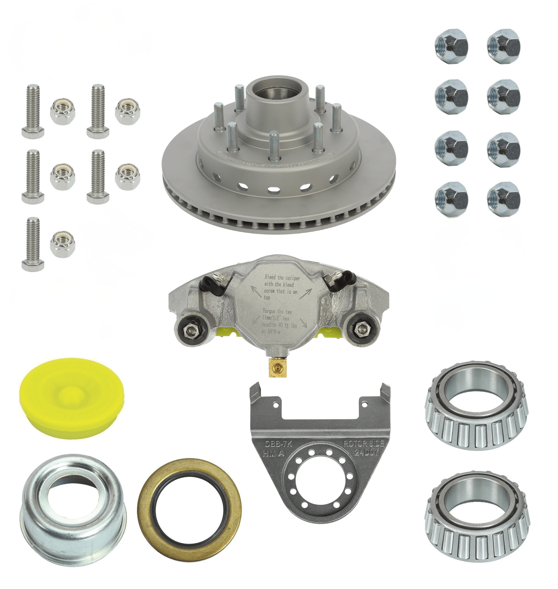 - Each 1/DBI kit includes Rotor or Rotor/Hub, Disc Brake Caliper, Caliper Mounting Bracket, Inner Bearing, Outer Bearing, Dust Cap, Grease Seal, Mounting Bracket Hardware, Lugnuts, and Rubber Plug